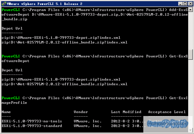Add-EsxSoftwareDepot D:\VMware-ESXi-5.1.0-799733-depot.zip,D:\Net-82579LM-2.0.12-offline_bundle.zip