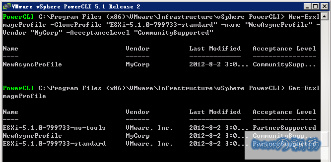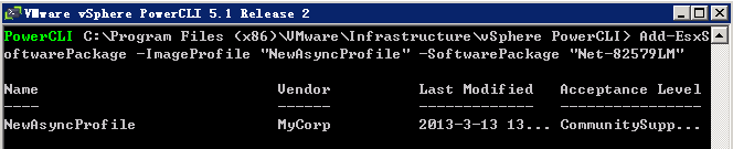 New-EsxImageProfile -CloneProfile "ESXi-5.1.0-799733-standard" -name "NewAsyncProfile" -Vendor "MyCorp" -AcceptanceLevel "CommunitySupported"