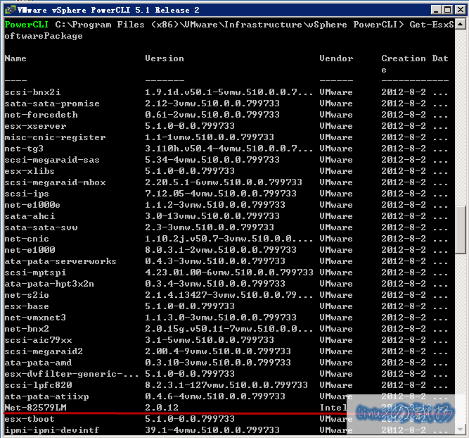先用Get-EsxSoftwarePackage 看看当前驱动包的名称为“Net-82579LM”: