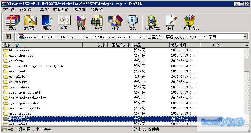 用Winrar 打开该主机镜像文件(脱机库)看看,可见自定义的第三方驱动Net-82579LM已经加入: