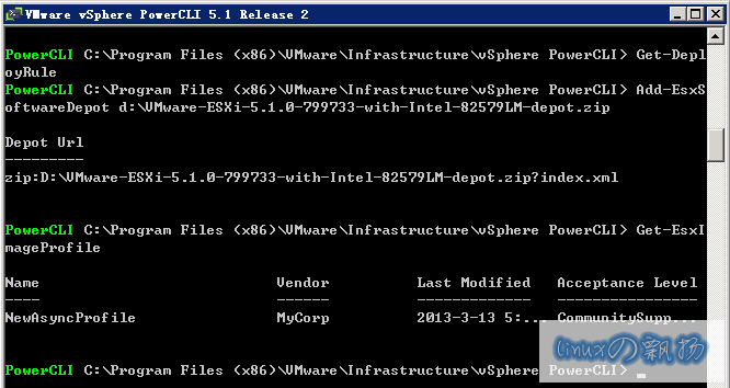 PowerCLI C:\Program Files (x86)\VMware\Infrastructure\vSphere PowerCLI> New-EsxImageProfile -CloneProfile "ESXi-5.1.0-799733-standard" -name "NewAsyncProfile" -Vendor "MyCorp" -AcceptanceLevel "CommunitySupported"