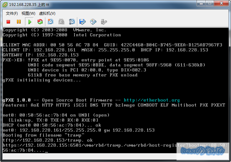 修改物理主机Bios 配置或敲热键使其通过网络引导,将获得动态IP及gPXE 启动: