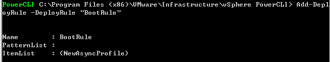 PowerCLI C:\Program Files (x86)\VMware\Infrastructure\vSphere PowerCLI> Add-DeployRule -DeployRule "InitialBootRule"