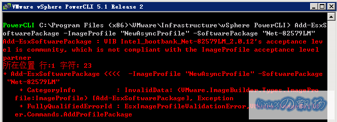 Add-EsxSoftwarePackage : VIB Intel_bootbank_Net-82579LM_2.0.12's acceptance level is community, which is not compliant with the ImageProfile acceptance level partner