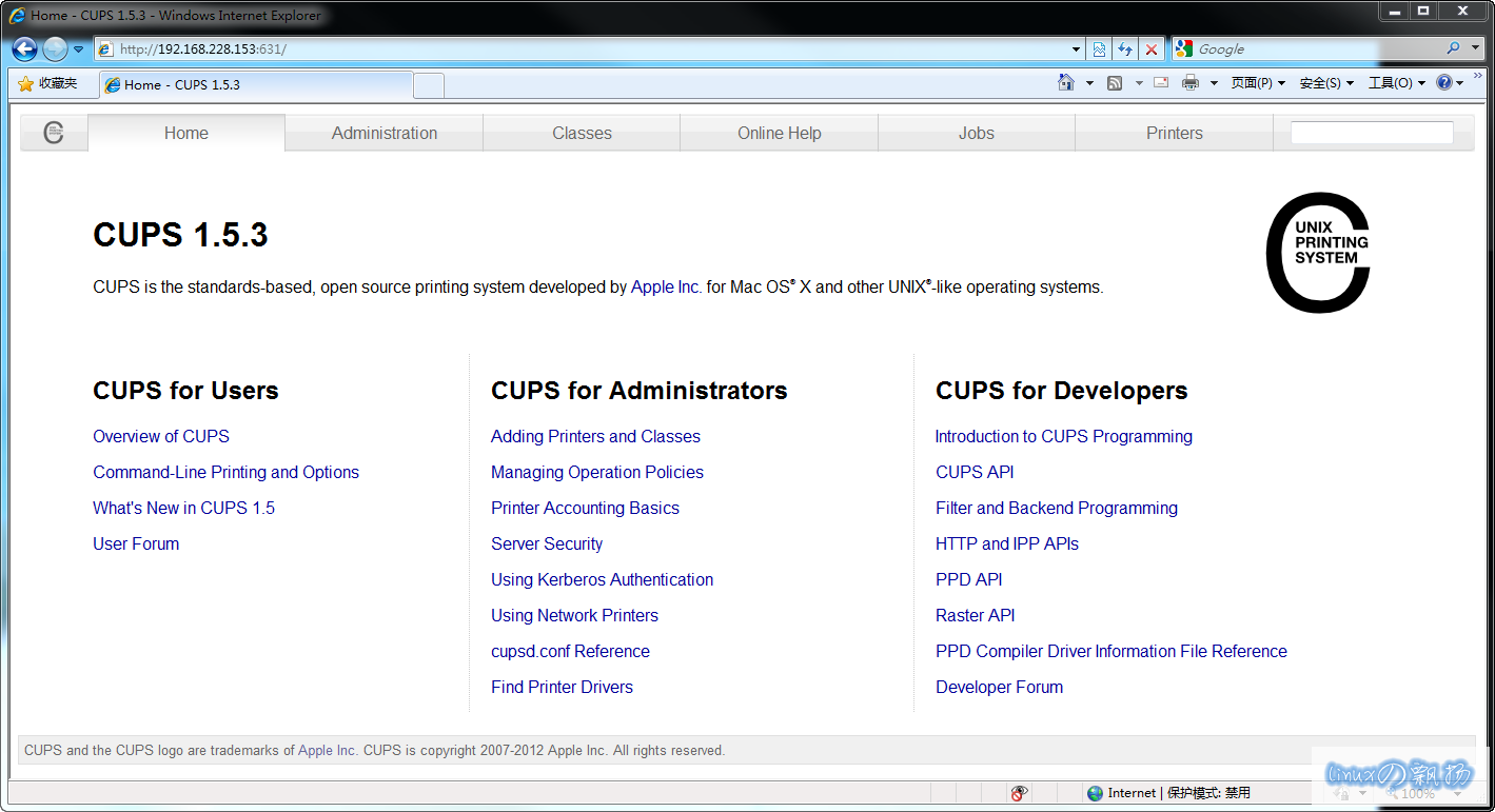 打开浏览器,访问http://192.168.228.153:631/,看是否正常。若有问题,可查看/var/log/cups/error.log 日志文件。