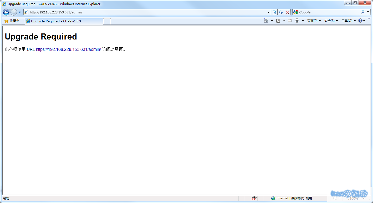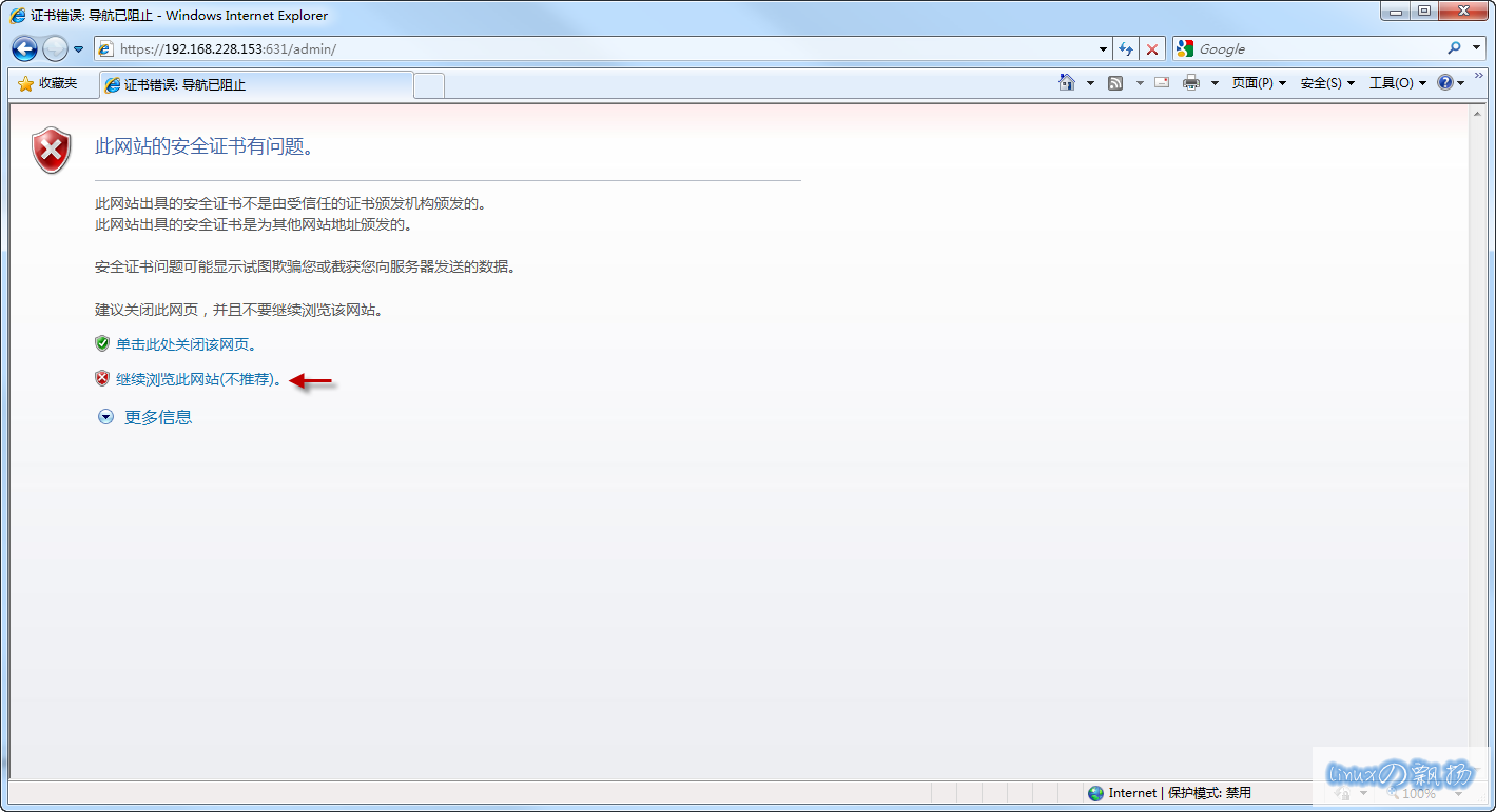 这是新版本为了安全增加的,改用浏览器打开https://192.168.228.153:631/ 即可,“证书错误”,继续吧: