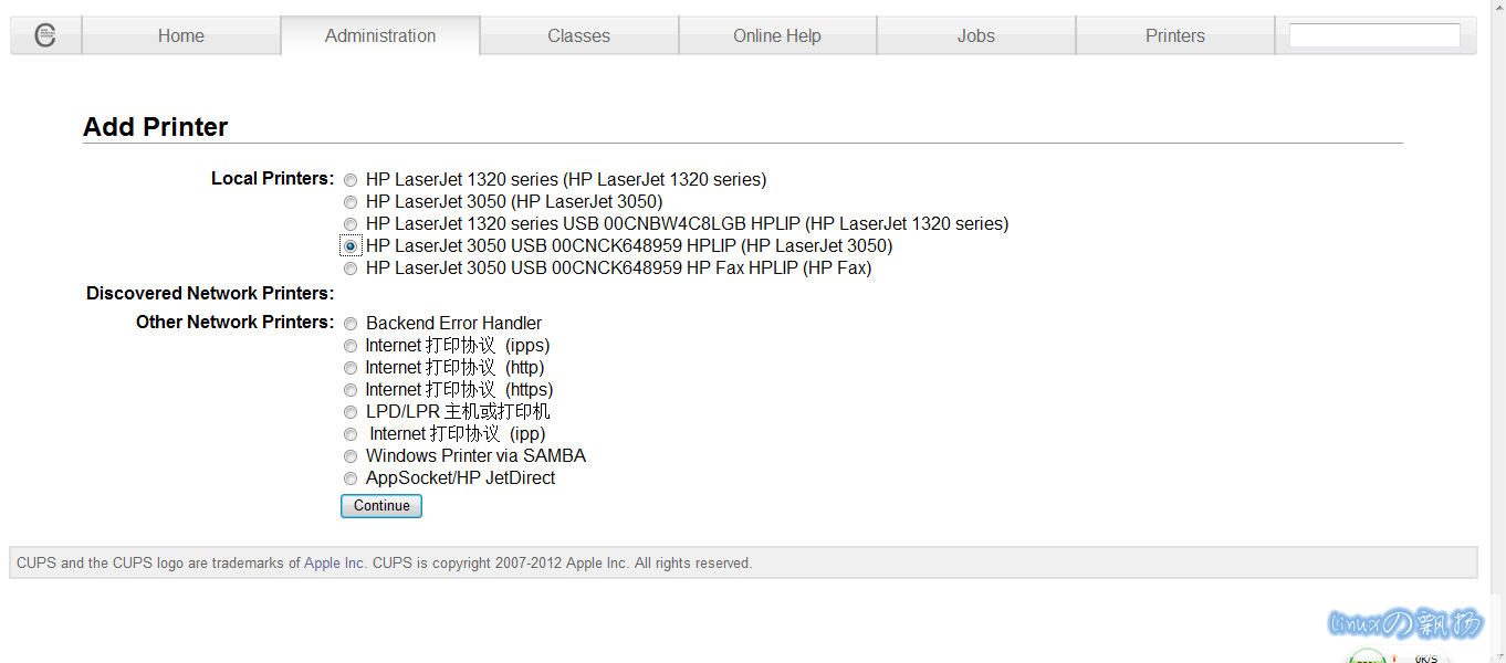 在“Add Printer” 界面上,应可看到“Local Printers” 显示对应的打印机 HP LaserJet 3050。我这里插入了两台打印机,每台有两个选项,3050还支持Fax功能,所以又多了一个。打印功能选择除Fax 外的任一都可以的。