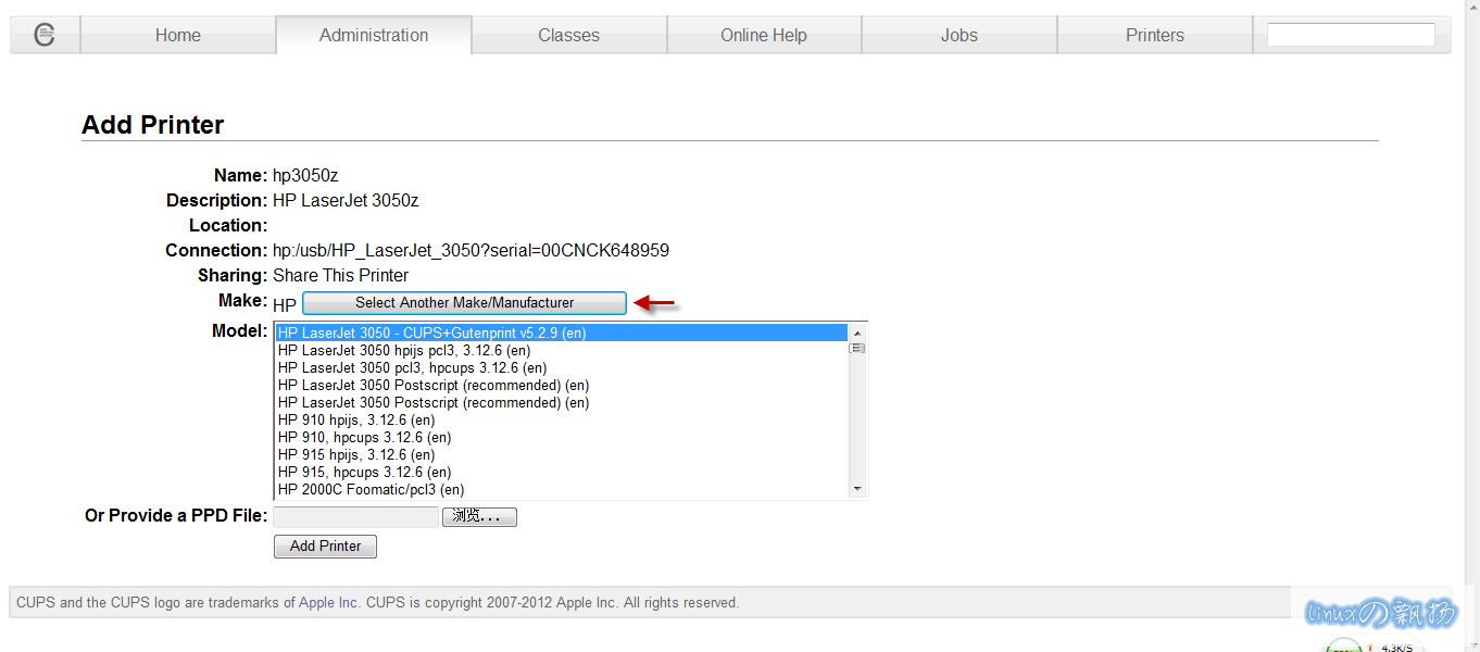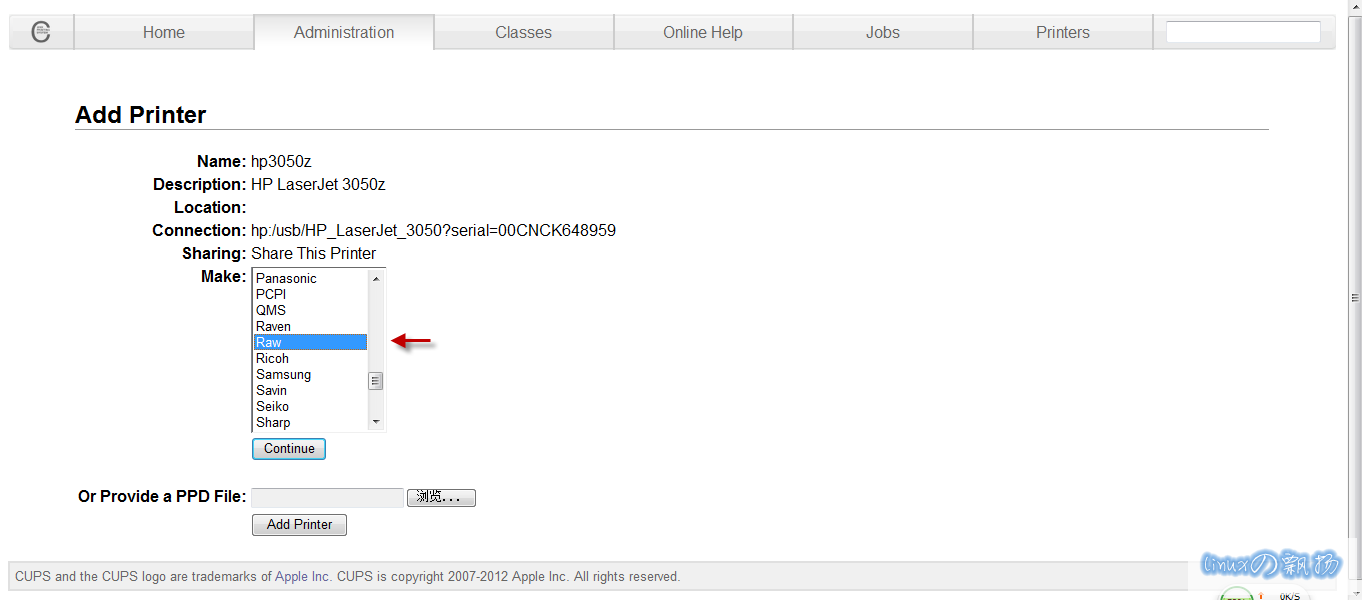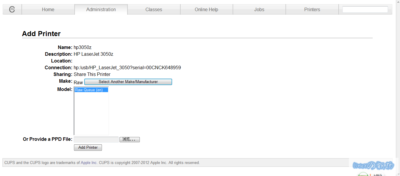 当然,添加打印机时,还是需要Linux 环境下的驱动(与CUPS 中的RAW 无关)。