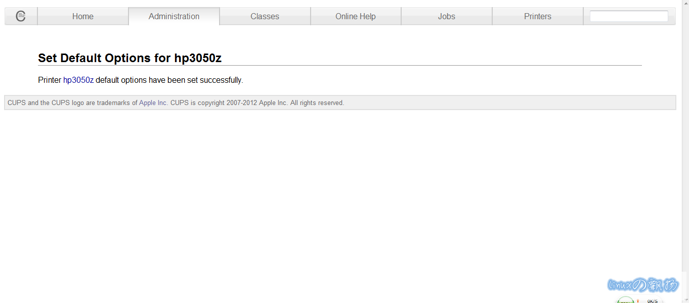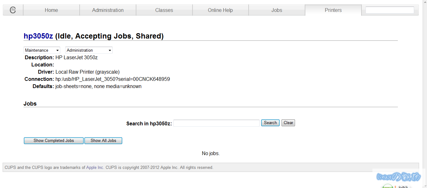 实际上就是由在添加新打印机时输入的打印机名称确定的,在这里就是hp3050z,而printers 前面都是相同的。如果不知道或忘了打印机名称,可通过浏览器访问“Printers”部分,然后打开对应的打印机,鼠标移到打印机的名称上,其链接就是打印机地址: