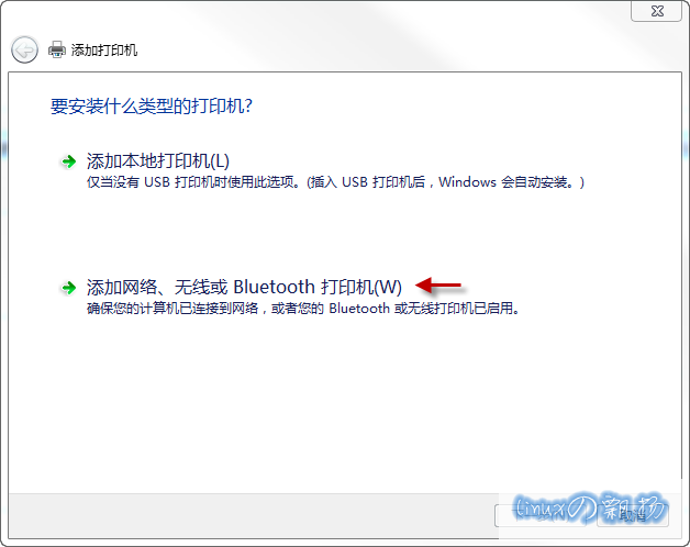 上述的工作已完成CUPS中网络打印机的添加工作,若需要访问该打印机。以Windows 7 为例,可在控制面板中选择添加打印机,然后选择“添加网络、无线或Bluetooth 打印机”: