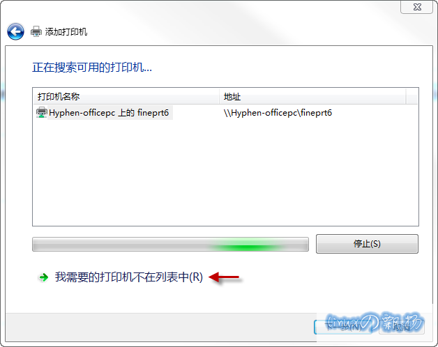 以上面方式共享的打印机在搜索中是找不到的,选择“我需要的打印机不在列表中”: