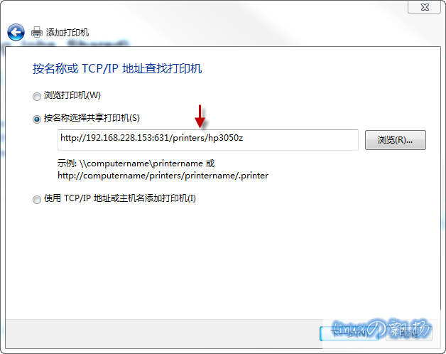 然后在“按姓名选择共享打印机”栏输入打印机地址: