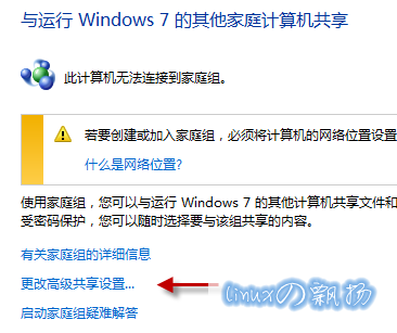 2.在切换到的“与运行Windows 7 的其他家庭计算机共享”界面,选择“更改高级共享设置”链接: