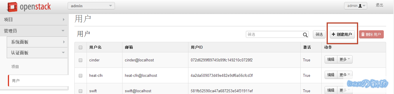 打开“管理员”——“认证面板”里面的“用户”,点击其中的“创建用户”: