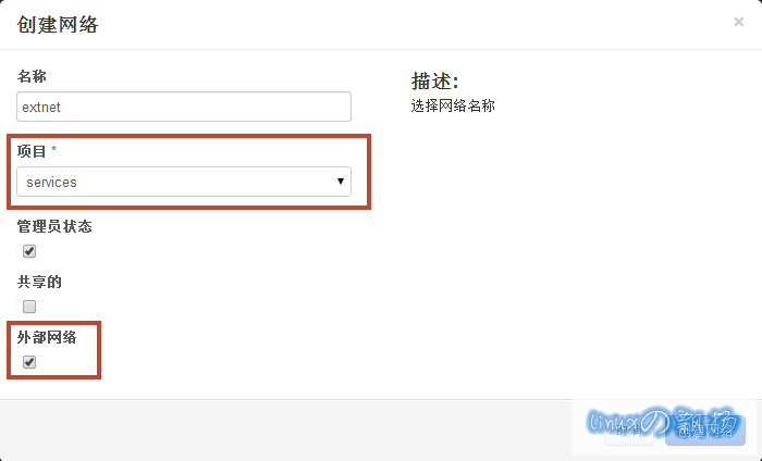 外部网络一般不属于特定的某个项目,可选择“services”表示为公共资源,并选中“外部网络”的选项框: