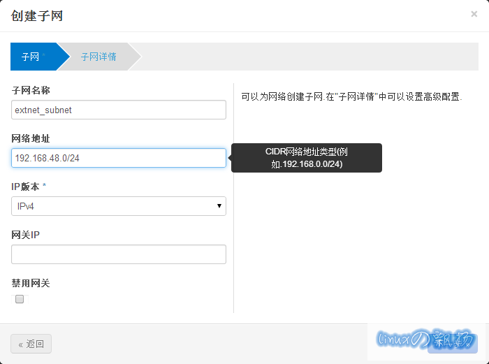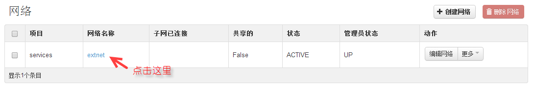 点击“网络名称”列下面的“extnet”链接,打开“网络详情:extnet”,点击“创建子网”: