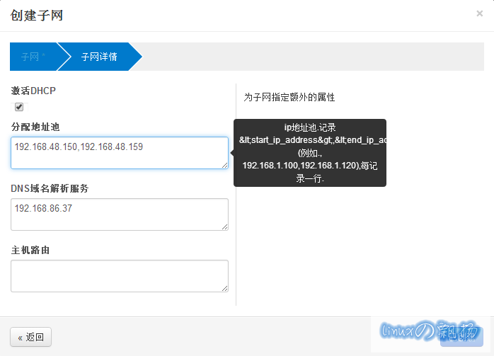 在“子网详情”部分,因为是私网网络,可以不用填写“分配地址池”,即按顺序全分配即可。“DNS 域名解析服务”中可以填写DNS 服务器的地址(内部或外部的都可以):