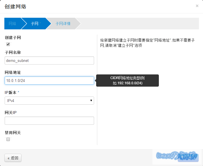 因为私网中每个项目的网络通常是隔离的,所以,子网信息中“网络地址”可任意定义一个网段(只要同一个项目中不重复即可):