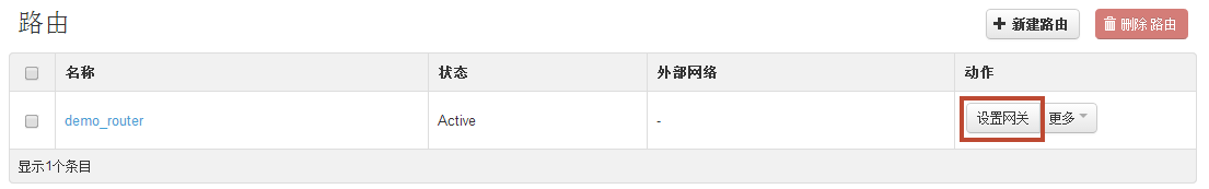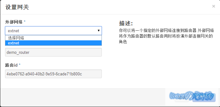 在“设置网关”弹出框中选择上面创建的外部网络“extnet”: