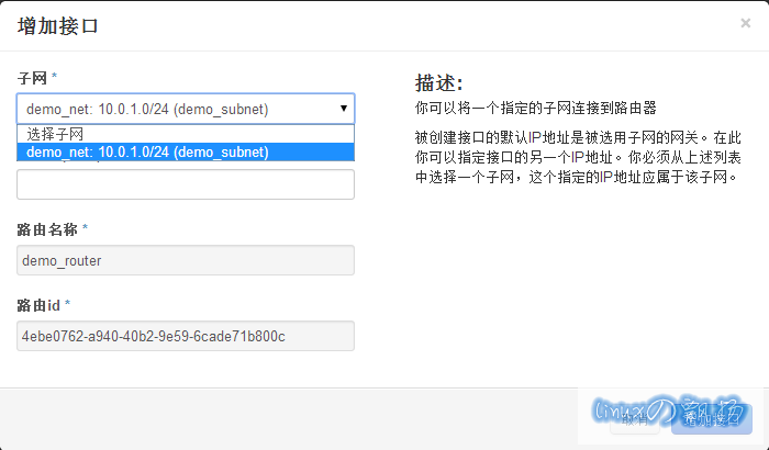 在“增加接口”弹出框的“子网”列表,选择私网网络“demo_net”: