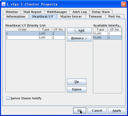 切换到“Heartbeat I/F”标签,然后把右侧可用的心跳(网络心跳)加入到左侧中(注意顺序):