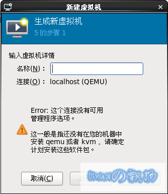 使用virt-manager 启动虚拟化管理器,创建虚拟机。这时,问题来了,提示:“这个连接没有可用管理程序选项”。