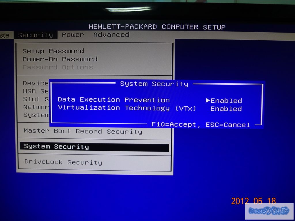 PS:这配置项实在难找,怎么会把Virtualization放到Security里面,想不明白。我来回找了好几次都没找到,最后没办法,只能联系HP才知道的。另外,有部分资料显示,修改后必须断电重启机器才能生效的。我没遇到,反正留意一下吧。