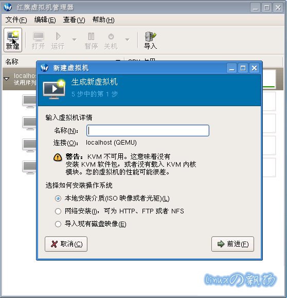 刚好运行Asianux 3.0的硬盘没有格式化,进入Asianux 3.0,打开虚拟化管理器virt-manager,创建虚拟机,发现也是有警告提示的: