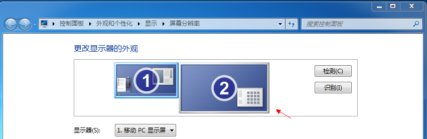 方法很简单,点击桌面上的“屏幕分辨率”按钮,在弹出的“更改显示器的外观”窗口,会显示两个屏幕,标记为“1”和“2”的。