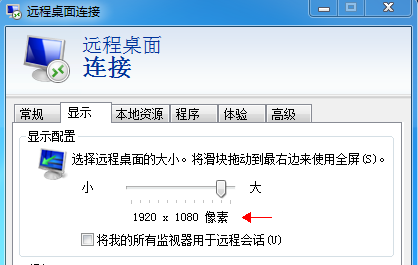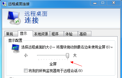 然后,打开Windows 7自带的“远程桌面”程序(在“附件”里面),然后选择第二栏的“显示”,在“显示配置”中,通常会被调整到最后的“全屏”状态的,例如: